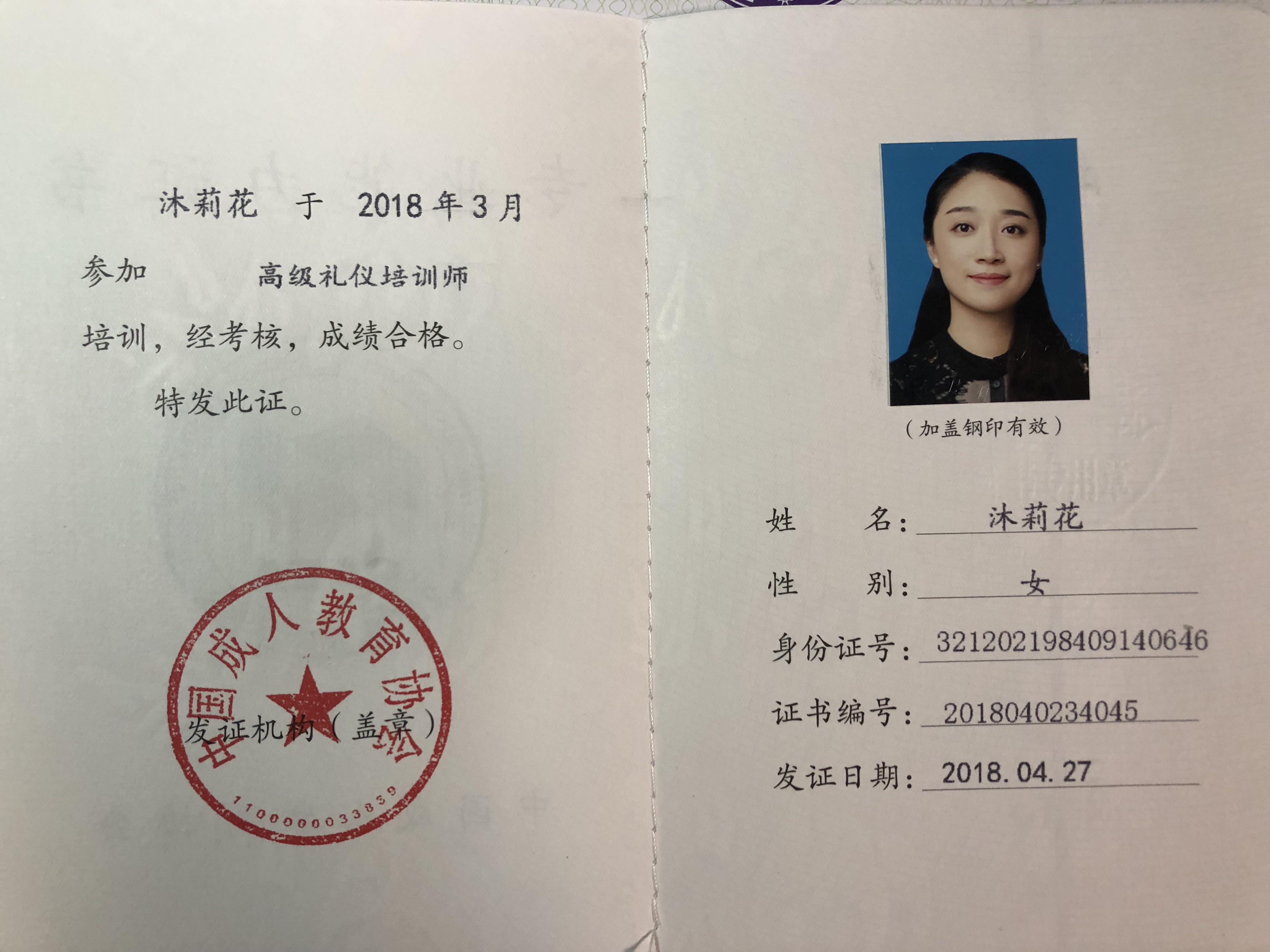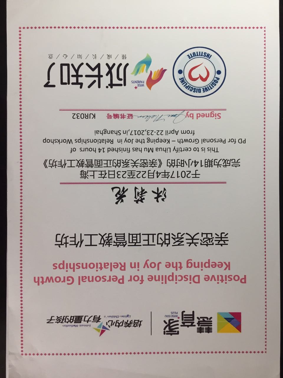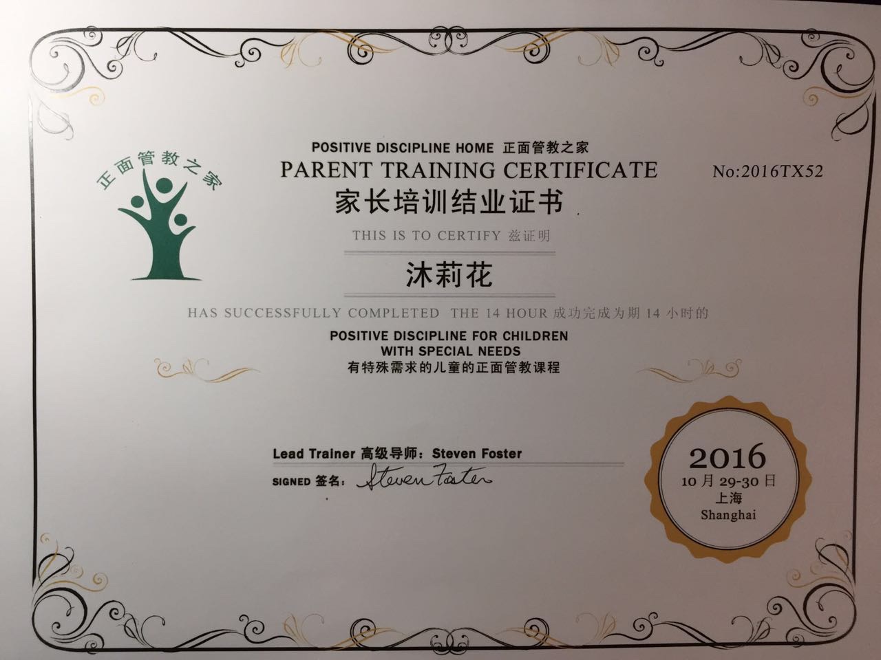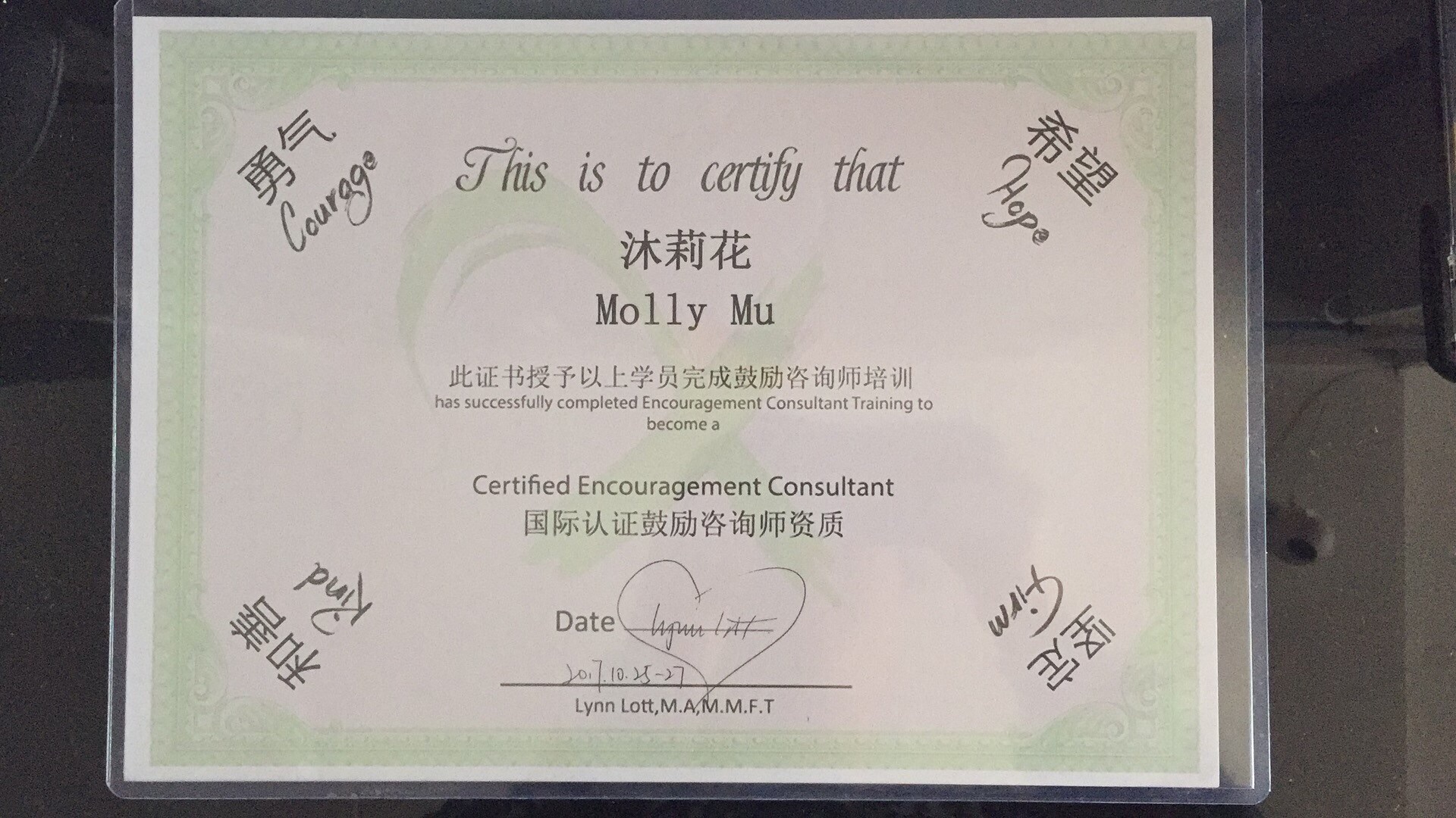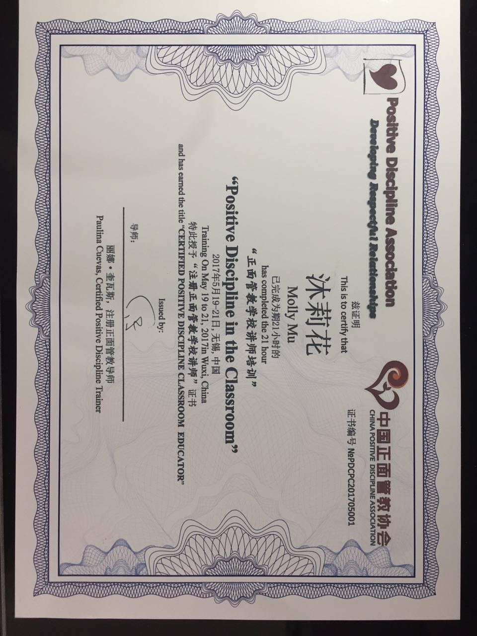 二级心理咨询师、国际鼓励咨询师;美国正面管教资质候选导师/家长讲师/学校讲师、亲密关系讲师;国内首批儿童社会情感发展讲师;沐爱成长家园创始人、无锡正面管教联盟发起人;无锡妇联新市民妇女联谊会秘书长;樊登小读者无锡分会会长