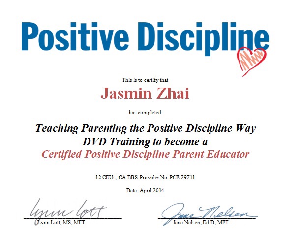 美国正面管教协会注册的家长/学校双讲师及导师候选人。独立完成22期(18小时/期)家长课堂, 为幼儿园,学校, 社区,企业等结构提供近百场公益讲座。自2017年,多次组织美国正面管教协会高级导师Dodie Bloomberg 来深圳举办家长/讲师资质班。