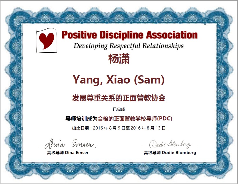 亲自带领正面管教父母课超过100期,带领正面管教家长讲师认证40期、正面管教学校讲师认证20期。加大正面管教的社会情感学习(SEL:Social &Emotional Learning)已经成功进驻北京公立名校人大附中、陈经伦中学和海淀实验小学。