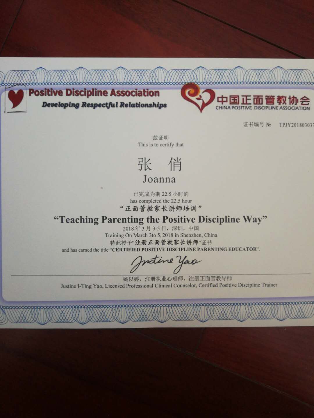 美国正面管教协会注册的家长/学校双讲师及导师候选人。独立完成10期(18小时/期)家长课堂, 为早教机构,学校, 社区,提供公益讲座。不断提升自我的正能量讲师