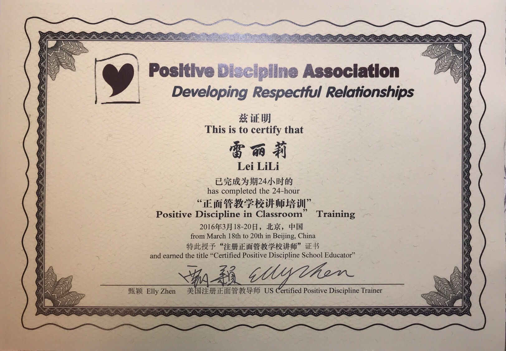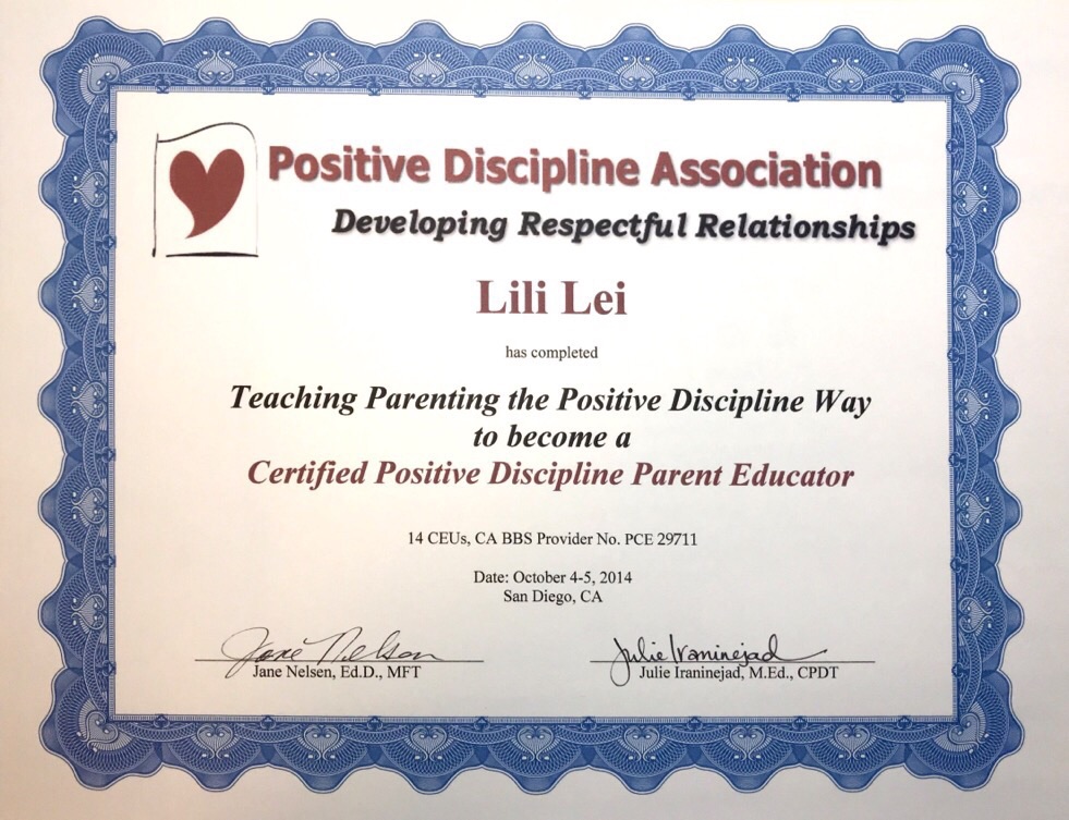 2013年9月接触正面管教,2014年10月,在美国跟随简·尼尔森学习取得家长讲师资质;2016年3月,师从甄颖导师取得学校讲师资质;2017年2月-3月,跟随琳·洛特学习取得国际鼓励咨询师资质(2017年11月,取得国家二级心理咨询师资质。2018年3月从高校辞职,从事正面管教、鼓励咨询和心理咨询工作。目前带领正面管教家长课堂、线上线下鼓励咨询小组和儿童社会情感课堂,以及个案鼓励咨询和心理咨询。